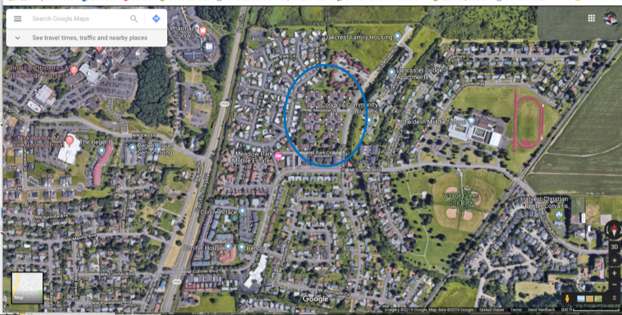 From 99W in Corvallis: Head North, Turn right onto Conifer, Turn Left onto Lancaster